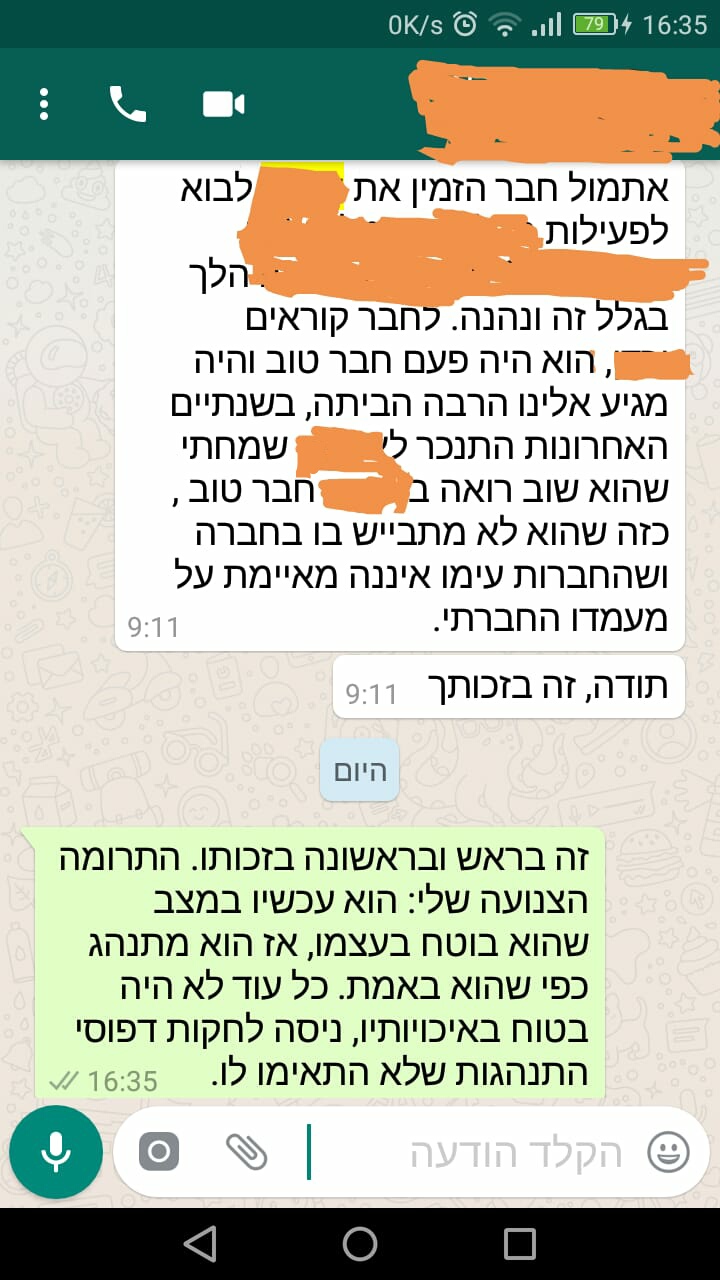 הודעת הוואטסאפ המצורפת מדגימה את תוצאות התהליך השיטתי: הילד חזר להתנהג בהתאם לטבעו ואינו חושש עוד למעמדו. הוא שוב מסוגל ליצור קשרי חברות עמוקים ובריאים, כי הוא כבר לא זקוק לחיקוי דפוסים זרים כדי להרגיש שייך.